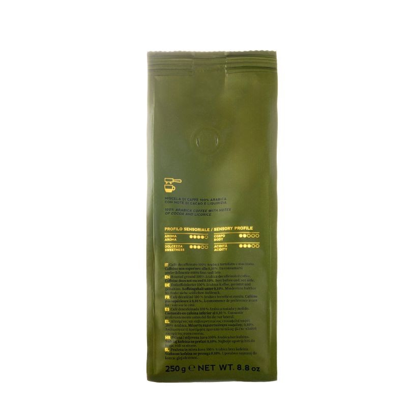 Café descafeinado 100% Arábica tostado y molido que ofrece el placer de una mezcla delicada con notas de cacao y regaliz. Presenta un aroma ligero y una suavidad distintiva, logrando un equilibrio perfecto entre cuerpo y una acidez media. Ideal para disfrutar de todo el sabor del café con un contenido de cafeína no superior al 0,10%.